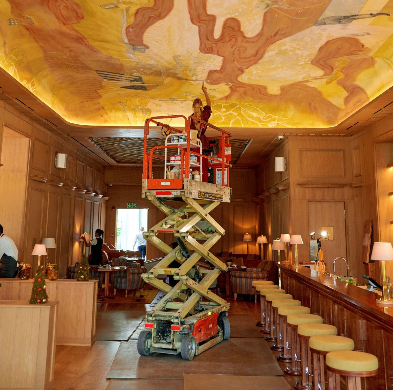 “Walls, floors laid, electrics, in-built furniture - painting long days and nights as the space became itself. The final painting is a difficult thing to get an angle on. The ceiling is just too close to photograph in one go, and too big to take in standing only in one position. I painted as it is to be viewed, looking up, working my way around.”