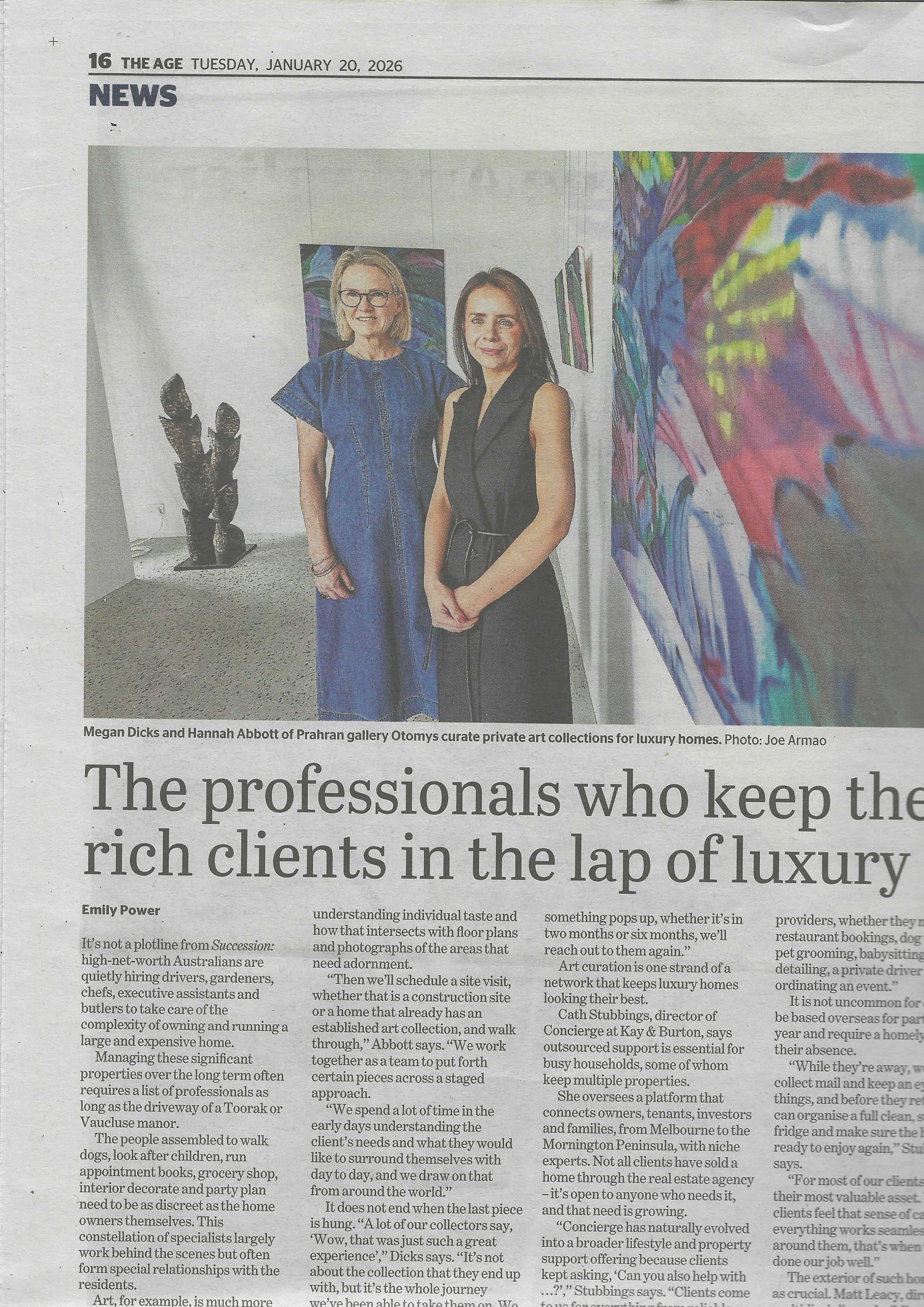 The Age features directors Hannah Abbott and Megan Dicks in its January issue, exploring their work curating private art collections for luxury homes. They share insight into their approach to private art curation, where architecture and emotional connection guide the shaping of deeply individual collections for homes across Melbourne and Sydney.